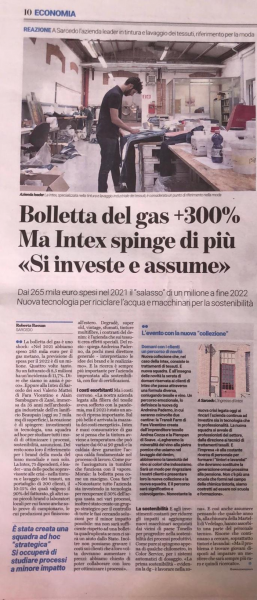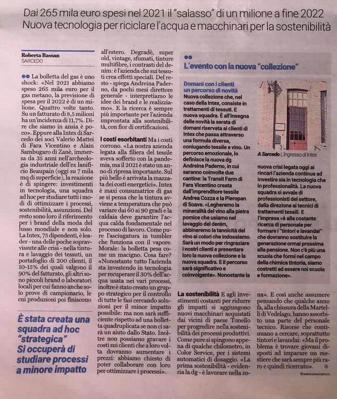 A Sarcedo, l'azienda leader in tintura e lavaggio dei tessuti, riferimento per il distretto di moda, investe in nuove tecnologie per riciclare l'acqua e per macchinari ad hoc per la sostenibilità ambientale: due settimane fa usciva un articolo del Giornale Di Vicenza che parlava della nostra azienda INTEX.