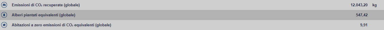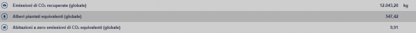 -  Considerando che un albero occupa una superficie di 2,0 m², 547,89 alberi piantati occupano una superficie di 1095,78 m².Emissioni di NOₓ recuperate: 30,13 kg.                                                                 Emissioni di SOₓ recuperate: 60,27 kg. TEP recuperati: 5,01 t.